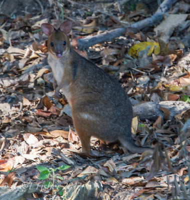 Red-necked Crake have again been heard without being seen but a Buff-banded Rail was seen foraging around the edge of one of the McDougall Road lagoons late one afternoon. A pair of Bush Stone-curlew with their chick, who were in and around the local nursing home, have moved up to the Lodge grounds. They have been seen and heard most nights coming around the units and working the camping area, the chick is very cute! The Red-tailed Black-Cockatoo reported as being heard last blog were seen for most of the past two weeks foraging in the eucalypt trees around the Lodge and Geraghty Park, at least 17 birds were present. Double-eyed Fig-parrot were also seen foraging in the camping area on some fruits for a few days before disappearing. Channel-billed Cuckoo are around but not calling, two were seen perched in Geraghty Park and several others flying over. Barking and (Lesser) Sooty Owl have only been heard but Eastern Barn Owl have been regularly seen. This one was roosting in the open, look who's in the background, our indicator bird - the Pale-yellow Robin!